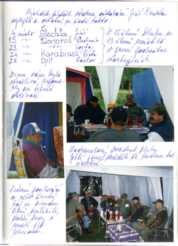 Konečně jsme na stříbrňáku je 31. května 1997 je pěkná zima, v noci jen 3C°. Rozdělili jsme bivaky a přichystali se na ráno. Potom jsme si zašli na pivečko a nálada byla ohromná, jen přítel Ondra musel ulehnout neb se vrátil z Afriky a nezvládl teplotní rozdíl. Tam se na nás začali vytahovat Luňáci (rybář.parta K.V.) chtěli se vsadit o 20 000,-Kč ale my jsme rozumný klub a sázka o 1000,-Kč byla na světě. Ráno se Odra ptal, proč nebyl informován o provokaci luňáků, že by si ještě přisadil! Tak jak je zvykem v našich řadách začali jsme bojovat všichni jen Ondra a Pepča D. neměli po celý závod ani záběr. Nejlepe z clubu zabojovali bratři Šlechtové a Majorošové - zkrátka umí, Jirka Šlechta z celkovéhé počtu 573 závodníků skončil na velmi krásném " 4 místě " Z 15 členů se 13 umístnilo do 50 místa. Jedno je jisté : v Hradci moc dobře vědí že Fischstar club je z K.Varů je to parta která se dokáže bavit. Večer posedíme a zahřejeme se dobrým pitíčkem, Ondra zasponzoroval každému půlku grilovaného kuřátka, Jirka nám vysvětloval jak nachytal,proč nachytal a co bylo jeho tajemství. Naši kámoši Luňáci hned po závodech sedli do aut a zmizeli jak pára nad hovn.........Zatím co náš řev se nesl po vlnách stříbrného rybníků. Proto zase ahoj za rok tedy v roce 1998