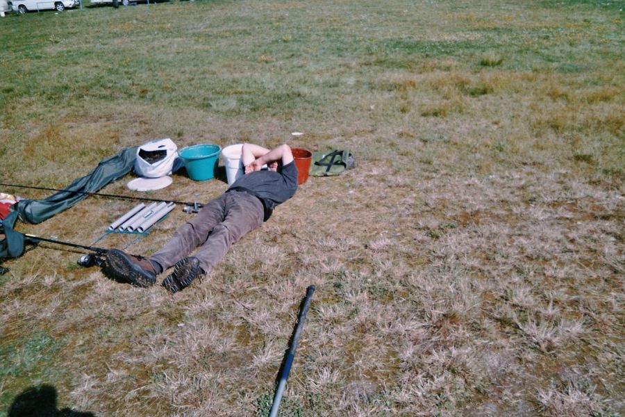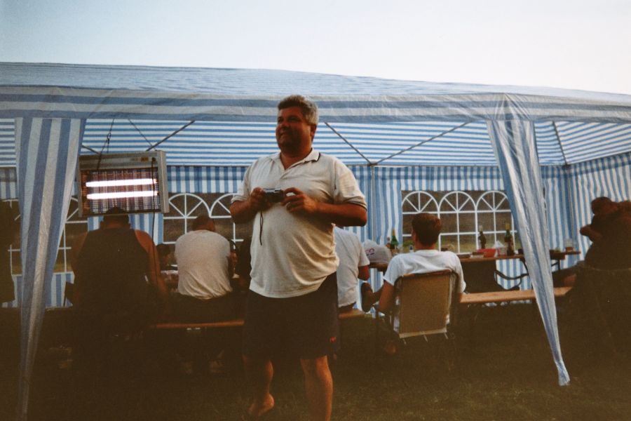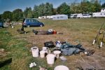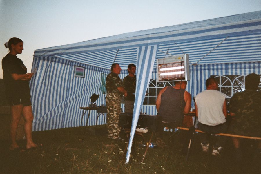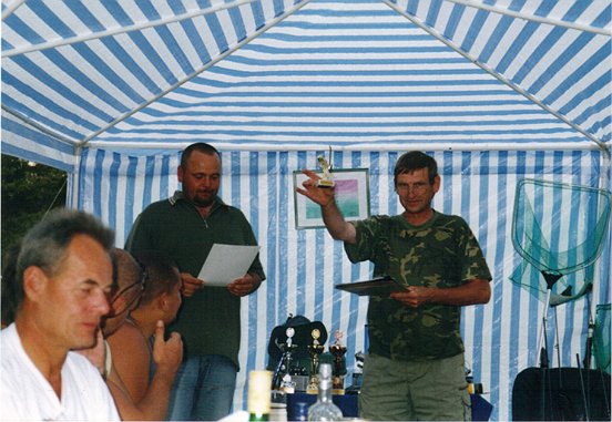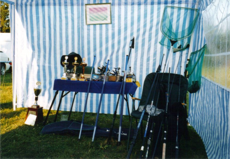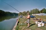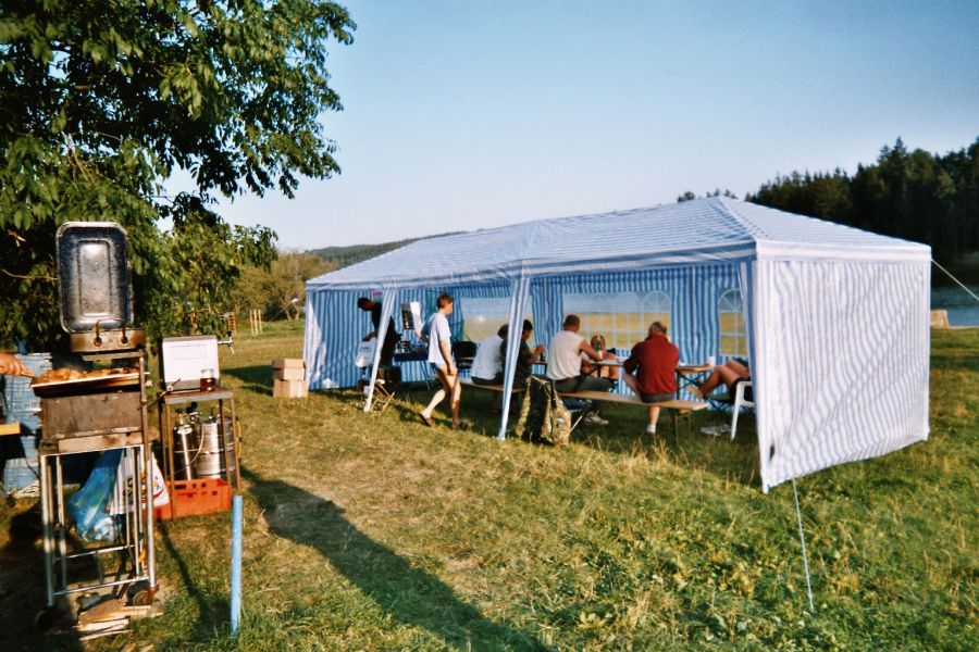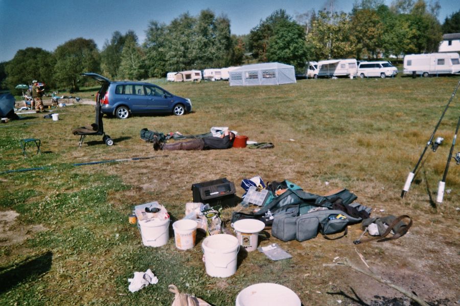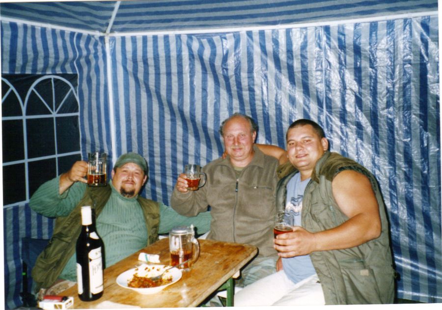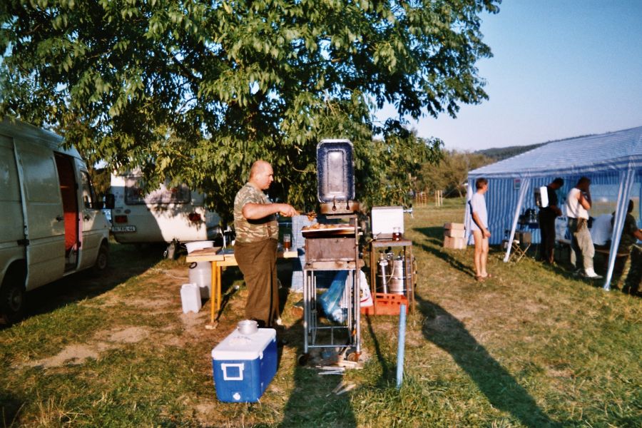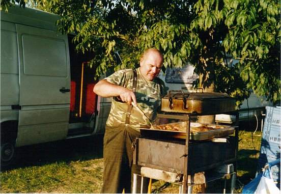 Naše kuchařky Fanda s Maruškou (jak už každý ví jedná se o Lexu)nám připravili zase velmi dobré papu což byla klobásová směs se žampiony, klobásy bez žampionů, drštková polévka, která byla na ráno, pečené papriky, sud piva. A k tomu potoky, co potoky ŘEKY alkoholu i troška nealko nápojů. Koupili jsme nádherný přístřešek, abychom byli všichni pohromadě a v suchu, ale nesplnil svůj úkol. Večer naše velké šapito bylo plně obsazeno, kamoš číčer byl tak unaven, že si ani nepamatoval kde usnul, samaritán Já.I mu musel dělat mámu. Náš mistr byl též unaven a odrazilo se to na jeho umístnění. Fopá zase udělal prezident clubu Petr Tóth neboli Já II. ,který nechal losovat místa k lovu a přitom jsme nebyli všichni. Byla to hloupá rozepře, ta pak vedla k dalším problémům. Ráno všichni naběhli na své posty a začal boj na život i na smrt o clubový titul. Ten chce každý, protože to má svoje výhody, neboť k výhře a titulu získává i poskoka na celý další rok. Na ryby si nemůžou stěžovat závodníci ani rozhodčí. Šly velmi dobře a rozhodovaly opravdu jen bodíky. Po závodech byl večírek a jedlo se, pilo, veselilo a zpívalo. Ráno bylo velmi zle neboť někteří borci se odmítli účastnit úklidu tábora a vyústilo to v ponorkovou nemoc, budeme jí lečit.Ahoj za rok.