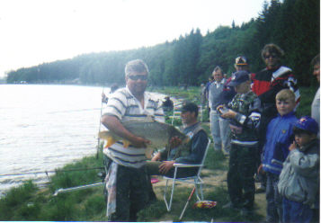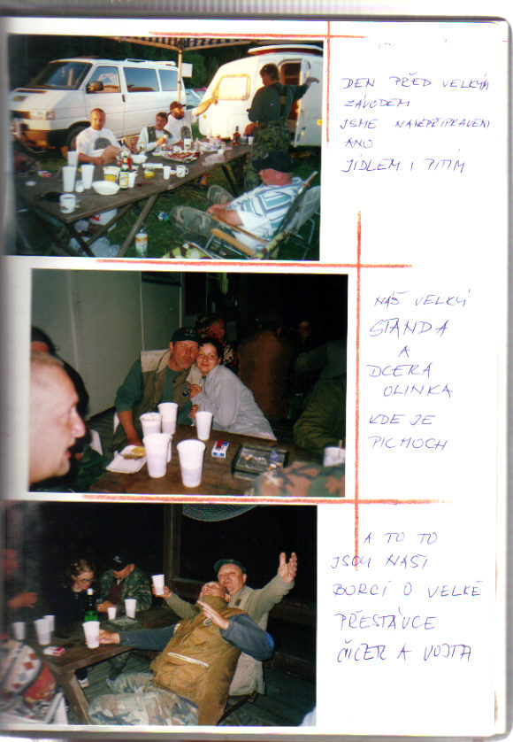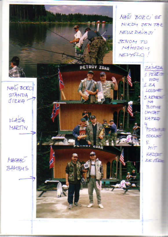 Jsou teamy co zachytají a jiní ani náhodou! Jako Zikmund s Fandóóó. Zato Jiřka a Vojta s krásným názvem svého teamu “ PINDA „ byli dobří!!! Každou rybu zapili panákem ferneštu a když došel šli do slivovice, pak tam předváděli divadlo tím že Jiřka předváděla ženu co má starého pardála, kupmi kožich na zimu, Vojta kontroval koupil jsem ti auto a ani jsi mi nedala. Se nediv když ležíte furt oba. Kolem jdou postávali a nevěřili co slyší, to bylo neustále kup a dostaneš. Skončili na 22 místě ze 134 teamů. Skoro všichni šli pro cenu a ti co nešli tak se těší na příště, touž snad půjdou.